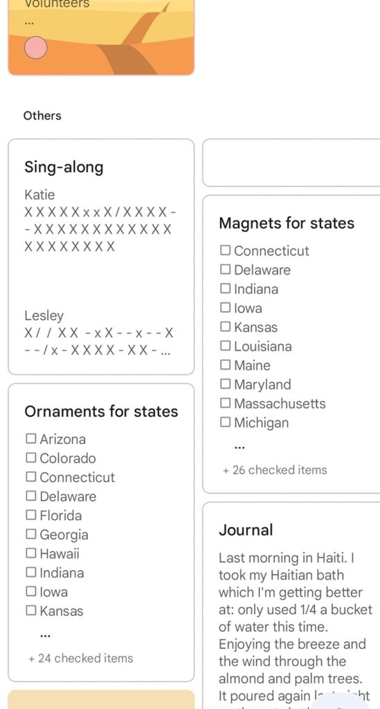 LISTS A LIST About Lists that are stored in my Google Keep app October 5, 2021 Lesley To Do TodaySing-Along ScorecardMagnets for StatesOrnaments for StatesShopping List for MansionHaiti Journal Share This List: Share on Facebook (Opens in new window) Facebook Share on X (Opens in new window) X Share on Pinterest (Opens in new window) Pinterest Print (Opens in new window) Print Share on Threads (Opens in new window) Threads